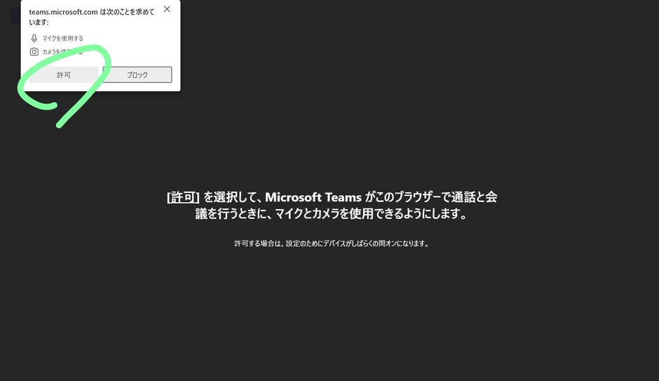 Microsoft Teams がこのブラウザーで通話と会議を行うときに、マイクとカメラの使用の許可を求めてくることがあります。