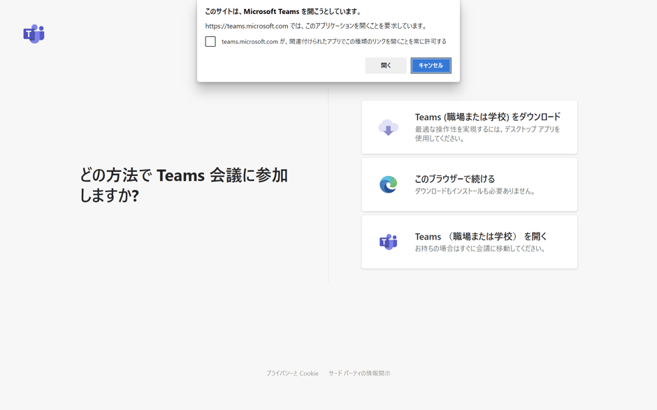 アドレスをクリックすると、ブラウザが開いて、「このサイトは、Microsoft Teams を開こうとしています。」というメッセージが表示される。